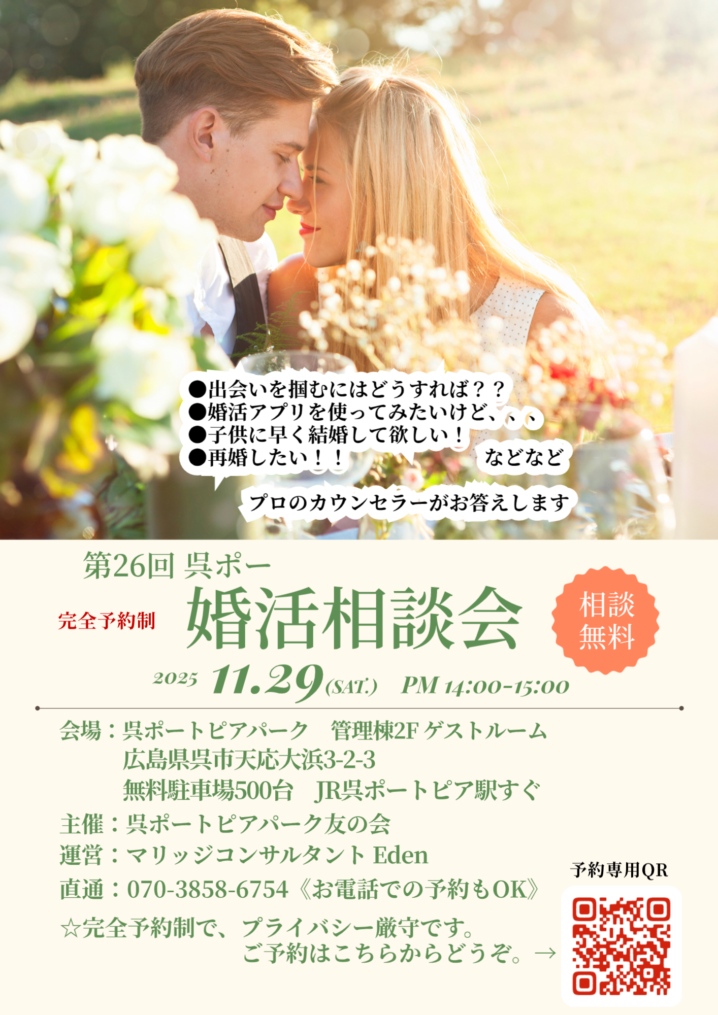 11月29日(土)第26回 呉ポー婚活相談会(無料)【完全予約制】